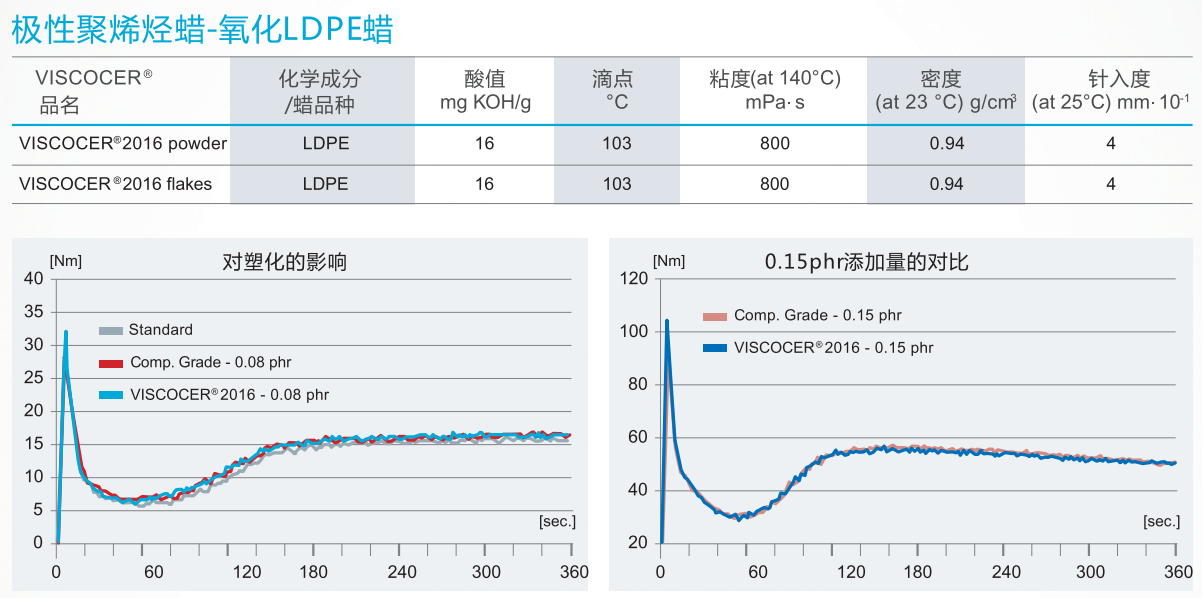 | VISCOCER@ 2216 | 低密度氧化聚乙烯蠟 | 100 | 16 | 230(140℃) | 0.94 | 白色粉末或片狀 | PVC潤滑劑、水性乳液 |