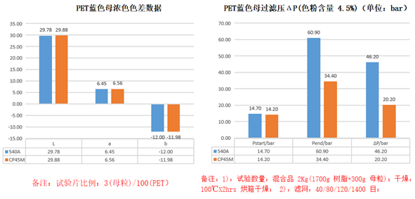 2、在PET藍(lán)色色母粒里面,CP45M過濾壓ΔP明顯比540A小,說明在PET藍(lán)色色母粒里面CP45M的分散性更佳。
