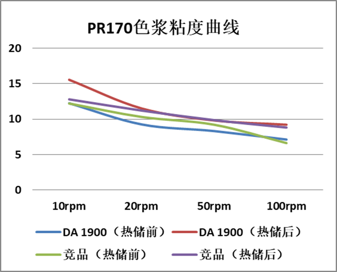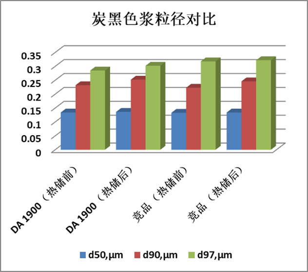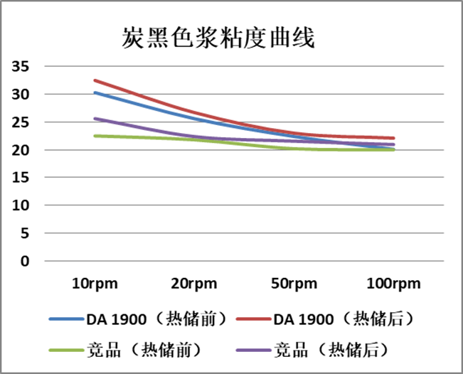 從以上結(jié)果可以看出,DA 1900對炭黑顏料有優(yōu)異的降粘效果,提供良好的儲存穩(wěn)定性和黑度。