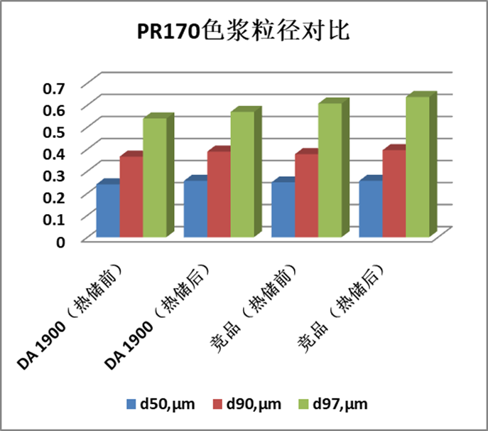 從以上結(jié)果可以看出,DA 1900對RP170紅顏料有優(yōu)異的分散效果和儲存穩(wěn)定性,并提供良好的色彩鮮艷度,飽和度。鈦白沖淡著色力強。
