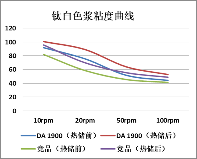 從以上圖表可看出,DA 1900對鈦白粉降粘效果好,可以制備70%的高顏料含量鈦白色漿,并且色漿的穩(wěn)定性優(yōu)異,50℃熱儲7天后鈦白粒徑穩(wěn)定,粘度穩(wěn)定。同時提供高的白度和強遮蓋力。